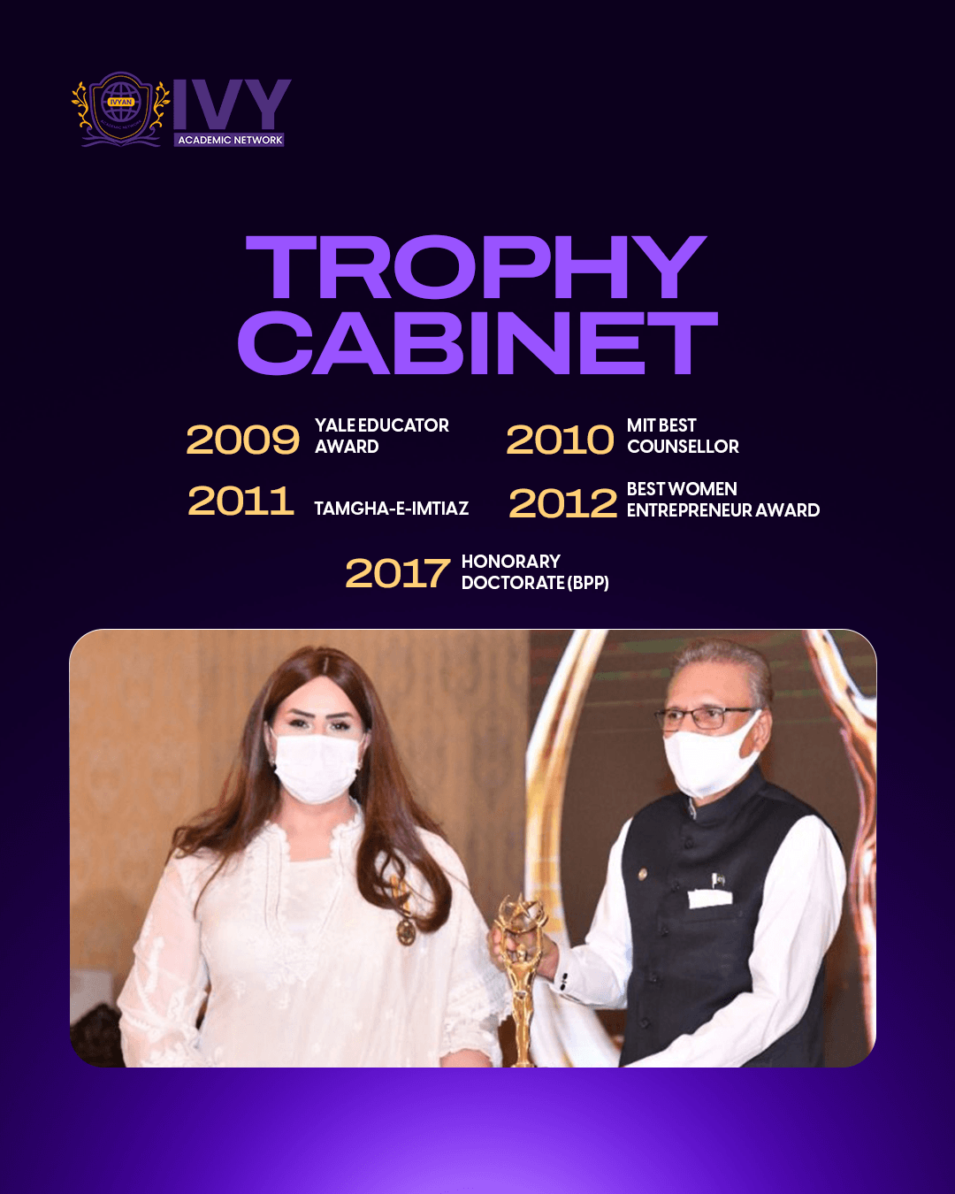 Dr. Khadija’s career was marked by numerous honors that recognized her contributions to education and entrepreneurship. From the Yale Educator Award in 2009 to the MIT Best Counsellor Award in 2010, the Tamgha-e-Imtiaz in 2011, the Best Women Entrepreneur Award in 2012, and an Honorary Doctorate from BPP in 2017, her “trophy cabinet” reflects a lifetime of dedication.