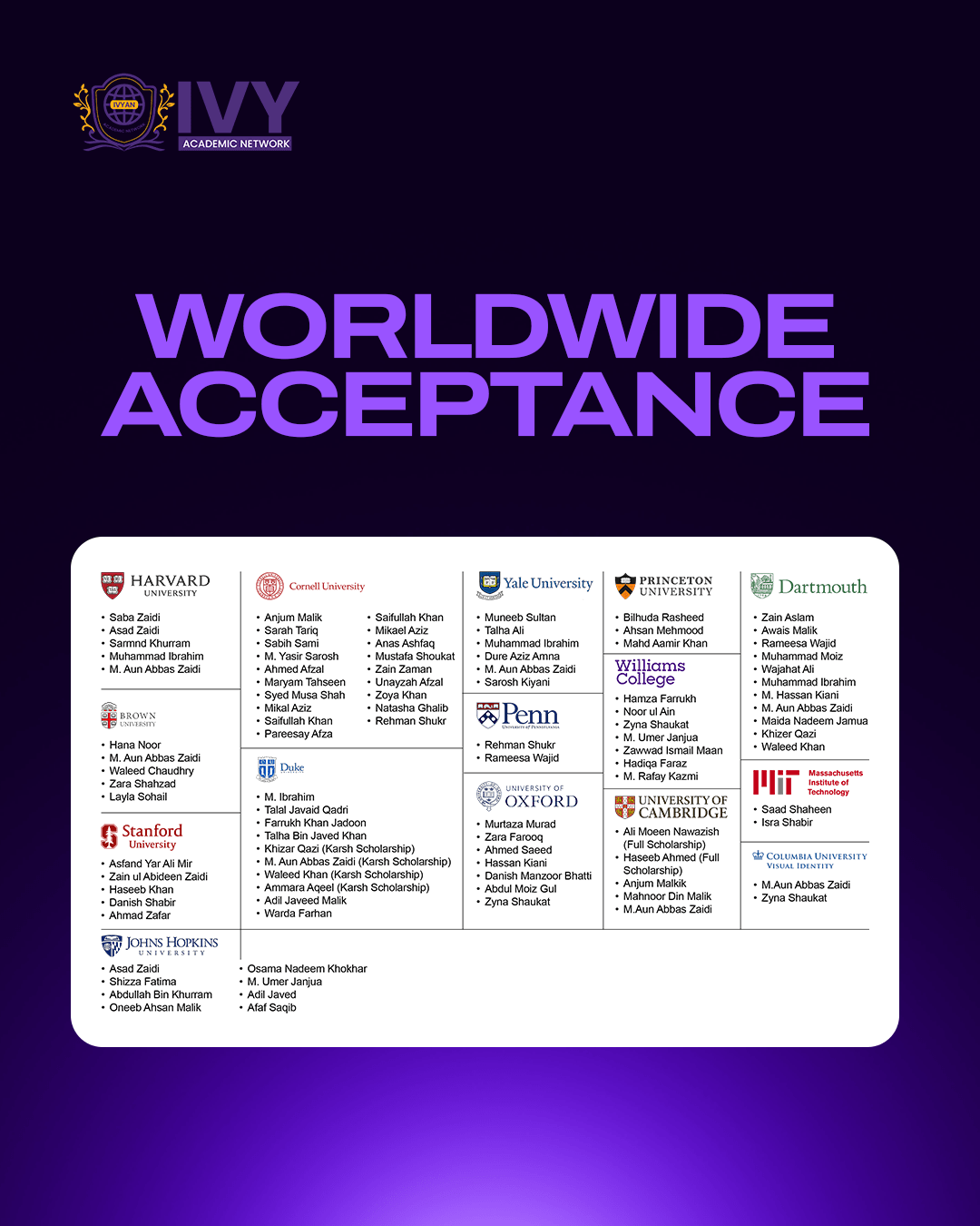 Dr. Khadija’s vision resulted in remarkable success for her students, with acceptances to top universities worldwide, including Harvard, Yale, Princeton, MIT, Cambridge, and Oxford. This “worldwide acceptance” list showcases names like Saba Zaidi at Harvard, Anjum Malik at Cornell, and many others, proving the global competitiveness of Roots IVY graduates.